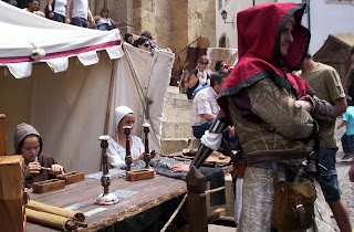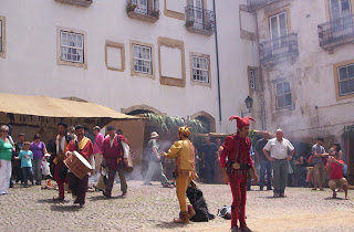 Suba as Escada de Quebra-Costas, em direcção ao largo da Sé Velha. Ena pá, tanta gente, parece você dizer. É a feira Medieval. É a 18ª realização da (agora) Fundação Inatel e da ADAAC, Associação para a Defesa da Alta de Coimbra. Parece que estamos na Idade Média, não é? Pois é. Olhe está a aproximar-se o “Bazilius”. Dê uma moeda ao mais famoso pedinte de Portugal. A sua caracterização e performance é plena. É um teatro vivo o desempenho deste homem simples.